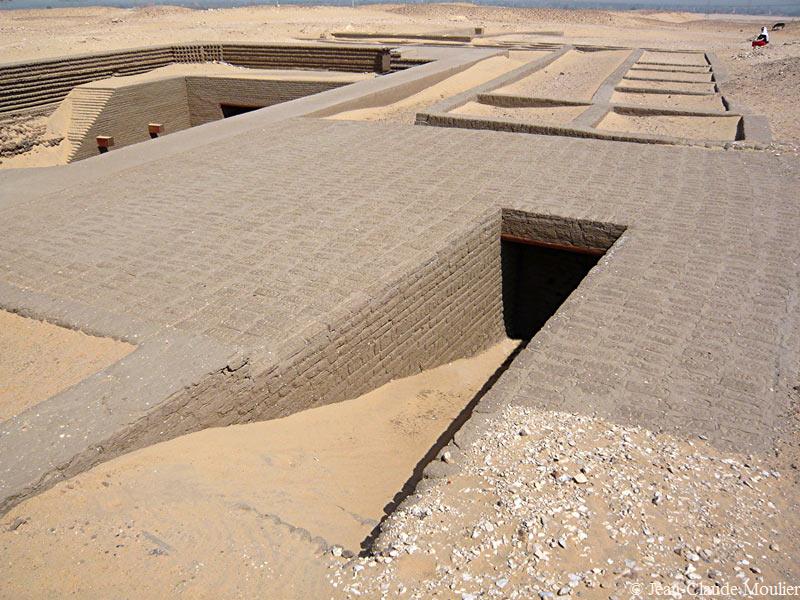 Tombe du roi Den à Umm-el-Qaab : La tombe est en haut à gauche. Au premier plan, la rampe correspond à l'accès de la tombe qui est sur le côté. Tout autour, les tombes annexes que vous pouvez également voir ainsi qu'un gros plan de l'entrée de la tombe, en cliquant ici. (Je remercie Jean-Claude Moulier pour ses photos qui me permettent d'illustrer cette partie, ainsi que pour ses commentaires).