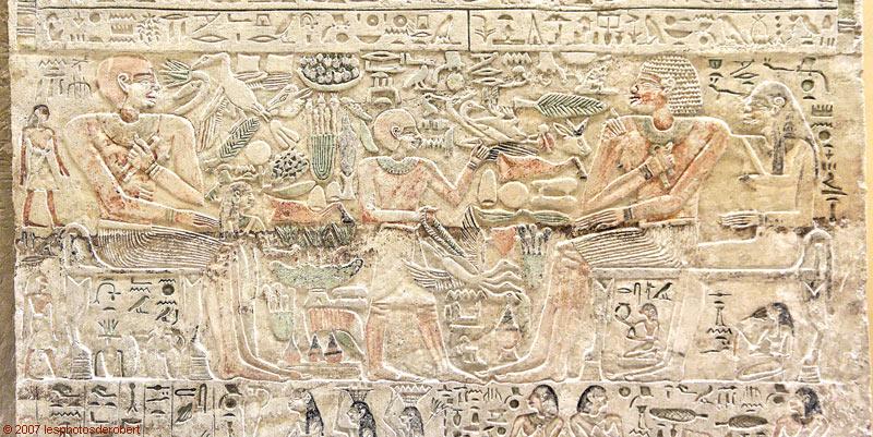 Détail de la stèle C3 : Le registre inférieur représente une scène d'offrandes d'huiles sacrées à laquelle participent trois porteuses d'offrandes et trois récipiendaires, assis sur des chaises, dont l'un est accompagné de sa femme (Sylvie Griffon). (retour vers le [Moyen Empire])
