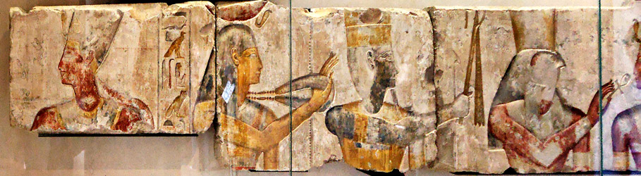 Le plus spectaculaire des panneaux se trouve porte les nomenclatures B10 à B14. Le commentaire du Louvre prècise qu'il vient du peit temple construit par Ramsès II à Abydos, peut-être le temple dit ruiné dont parle Mariette, proche du temple d'Osiris.