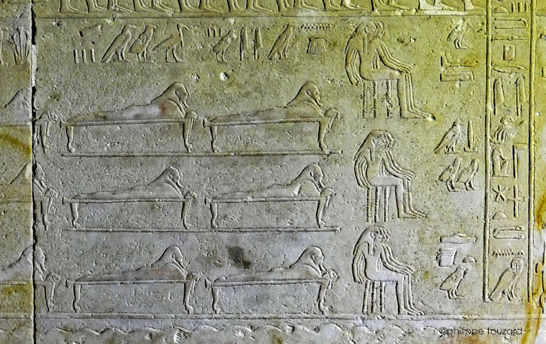 En bas, à droite, 3 groupes d'hommes sur des couches et 3 groupes de femmes.