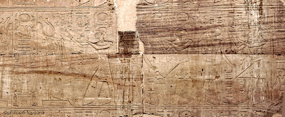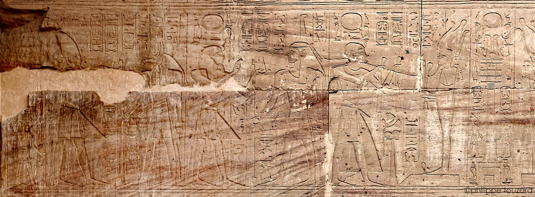 À genoux, Merenptah en posture d'adoration.