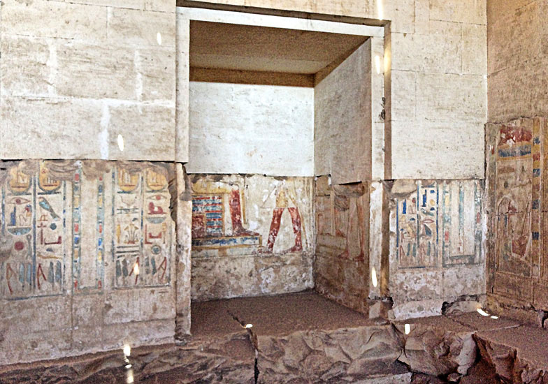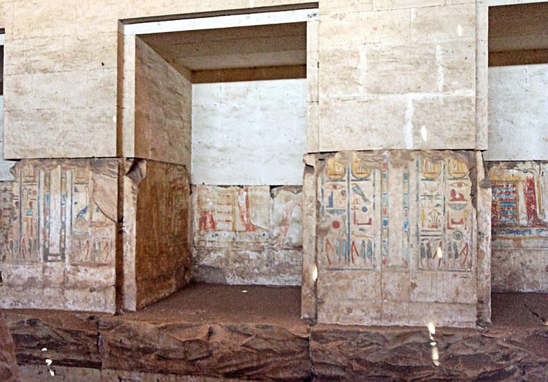 Niches du mur de droite : en face, cette niche (n°8 de Mariette) est dédiée à Heqet (montant de gauche non démoli) et à Osiris et Horus.
