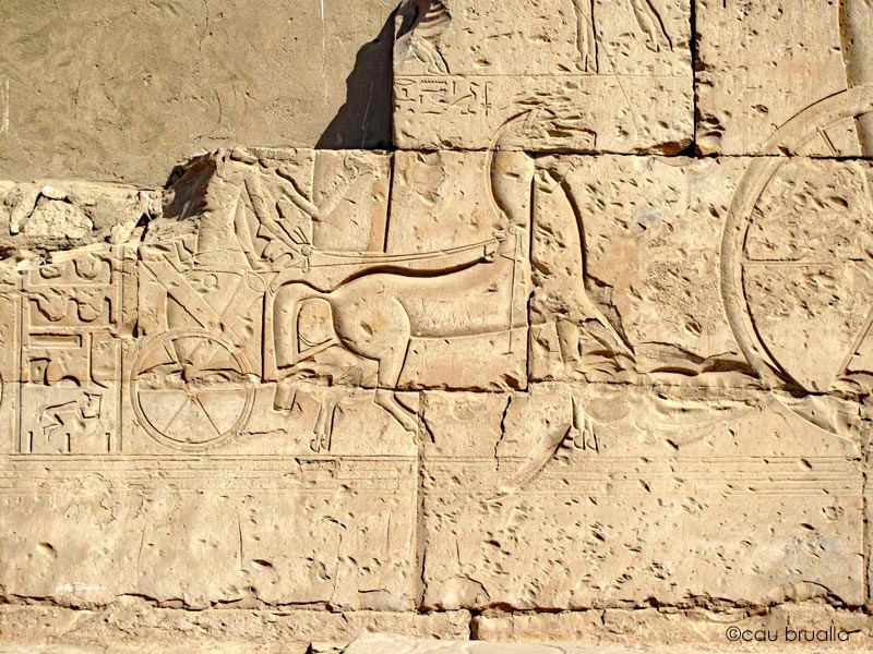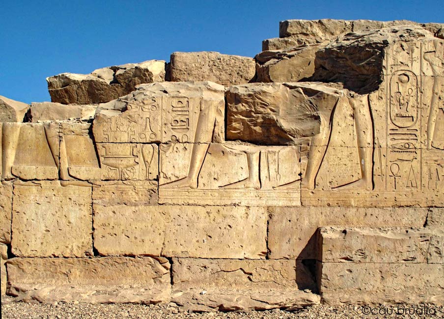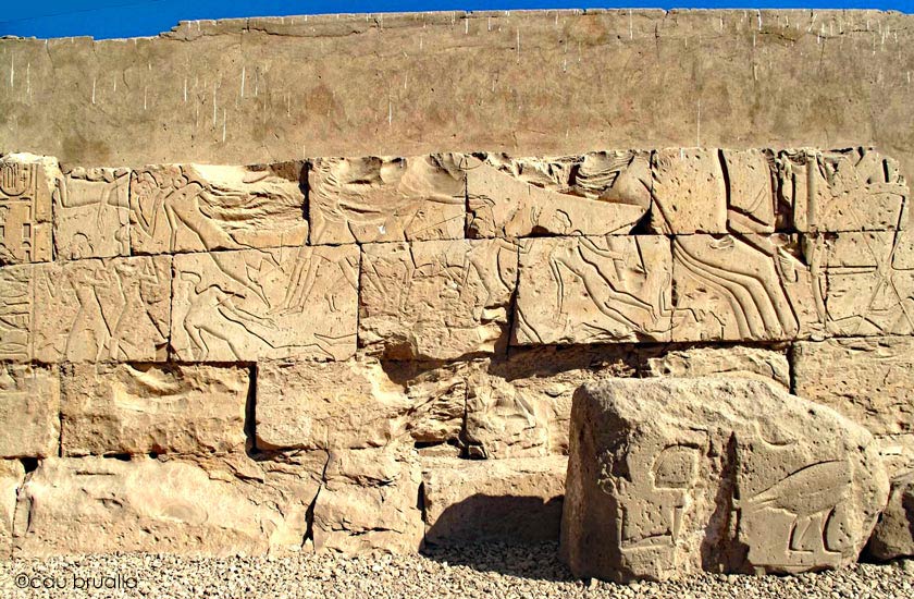 En plus des captifs, le roi apporte au dieu Amon des vases et l'image de la forteresse. Amon est accompagné d'un autre dieu,peut-être Sethy 1er divinisé dont le cartouche est inscrit à droite accompagné de l'expression : "Juste de voix". (A. R. David, 1972, p.20)