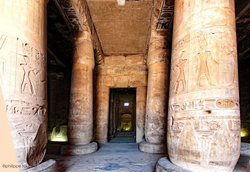 La travée d'Amon constitue la travée centrale qui court du portique à la chapelle d'Amon dont la fausse porte est visible dans le fond. Elle comprend deux rangées de 2 colonnes dans la première salle hypostyle et de 3 colonnes chacune dans la seconde salle hypostyle. L'offrande de la Maât à Amon-Rê est visible sur la colonne de droite, côté Est et sur la colonne de gauche à l'Ouest. Les vues ci-dessous montrent qu'elle est