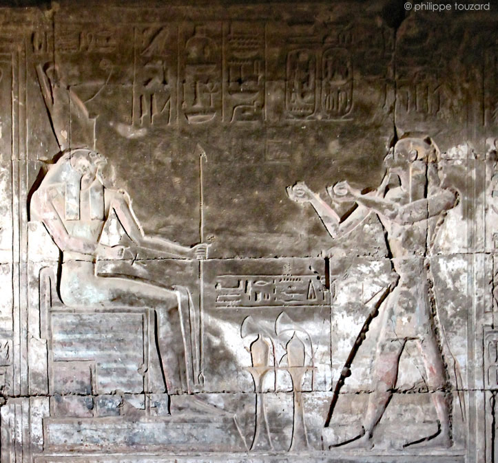 Sur le registre du haut, le roi présente du vin à Horus