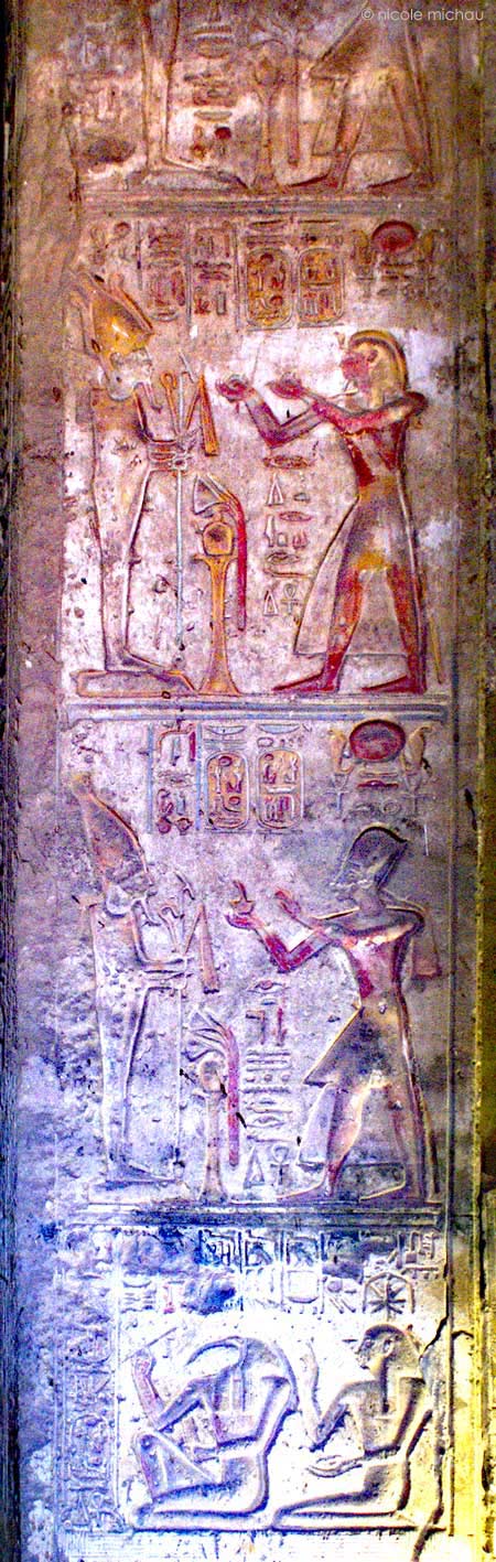 Ramsès II fumigène de l'encens en lançant des boulettes d'encens dans l'encensoir.