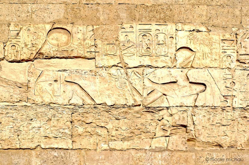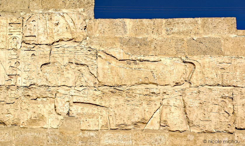 À gauche, la scène notée K par David(1973, p. 23). Le roi est représenté entre 2 divinités et fait une offrande au dieu assis qui est devant lui. Les scènes sont présentées dans ce site dans le sens du roi.