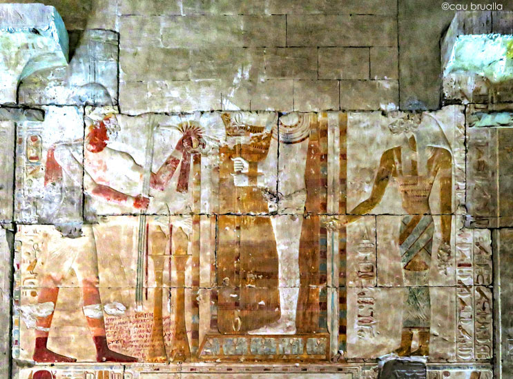 La déesse Mout, coiffée du pschent, un de ses attributs, présente le collier menat au roi. La peau de la déesse est jaune, celle du roi est rouge.