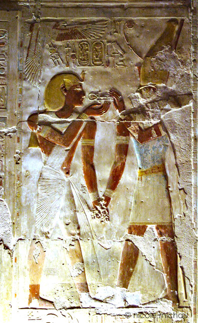 Scène du centre : Le roi fumigène de l'encens devant son "père". Osiris.