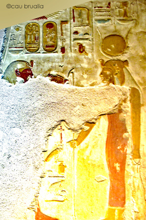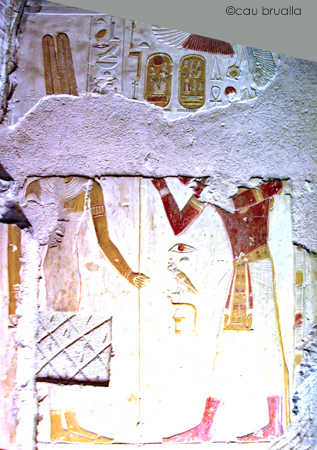 Is (placée du côté de sa chapelle) tient la couronne khepresh sur la tête du roi qui fumigène de l'encens devant Osiris. Isis porte la coiffure hathorique.