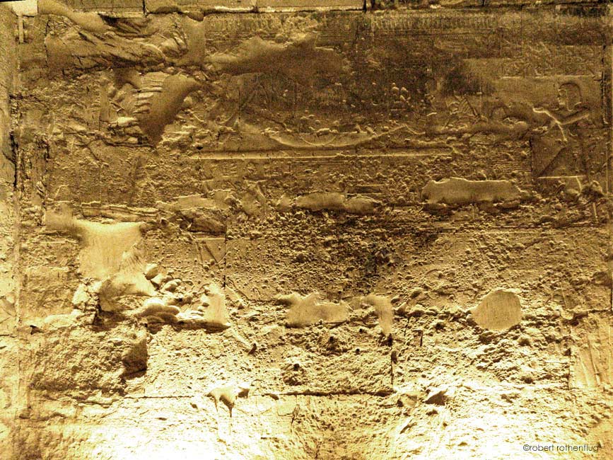 Ce côté de la paroi Nord est très dégradée compte-tenu de sa position au Nord Ouest. En haut, à droite, la figure du roi est bien reconnaissable devant la silhouette de la barque d'Horus. En bas, des restes de personnages se devinent. Le site AbydosSethy.net donne une analyse de ces scènes et des inscriptions restantes.