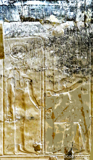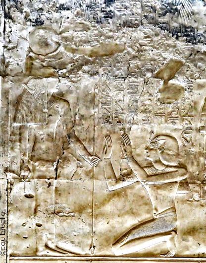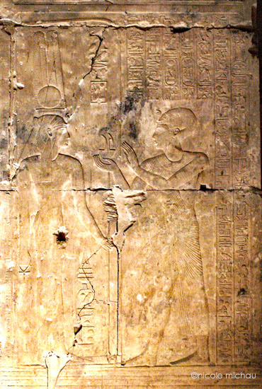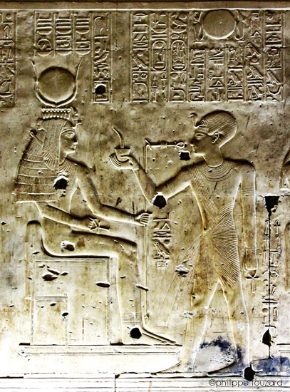 Le roi (Men-Maât-Rê)I fumigène de l'encens devant Isis. Cette action se situe dans le chapitre "entrer dans le sanctuaire"La déesse lui donne toute bravoure, toute victoire et toute joie.