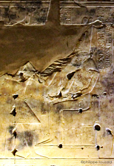 Le roi présente le collier Ousek au dieu Atoum-Khépri mais c'est Isis qui est représentée.