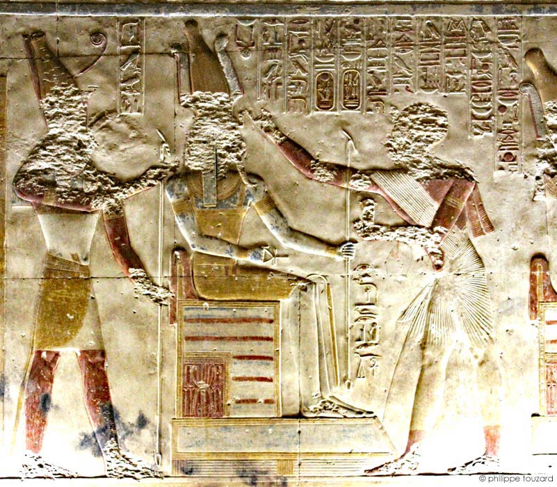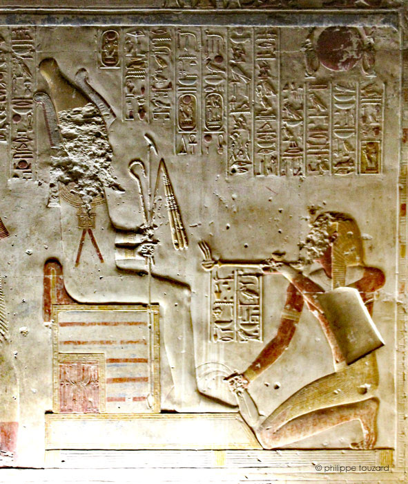 Le roi purifie le dieu avec de l'huile. Devant le roi, Osiris est assis dur son trône et derrière lui se tient debout Horus fils d'Osiris.