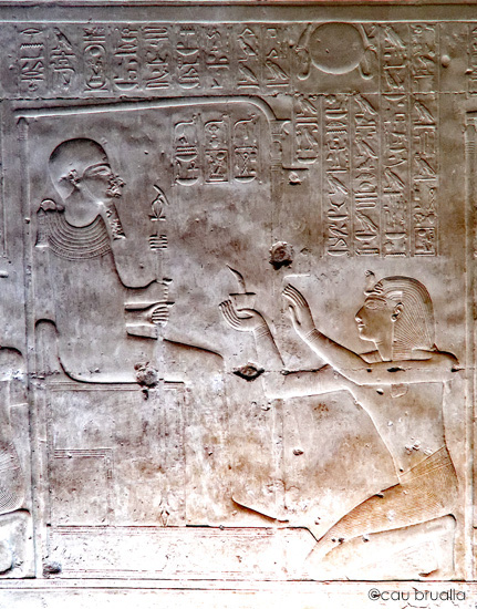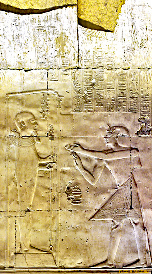 Le roi (Men-Maât-Rê)I fumigène de l'encens devant le dieu Ptah qui lui donne en retour la durée de vie de Rê.