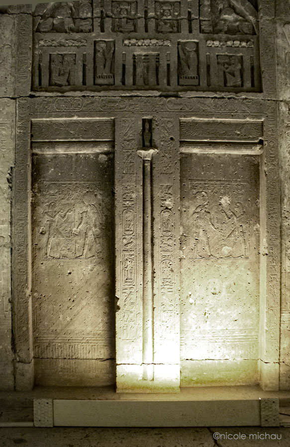 La paroi Ouest comporte une fausse porte décorée, dite fausse car elle ne permet d'accéder à aucune salle. C'est une porte virtuelle, magique qui permet de communiquer virtuellement avec d'autres lieux, temples, chapelles..