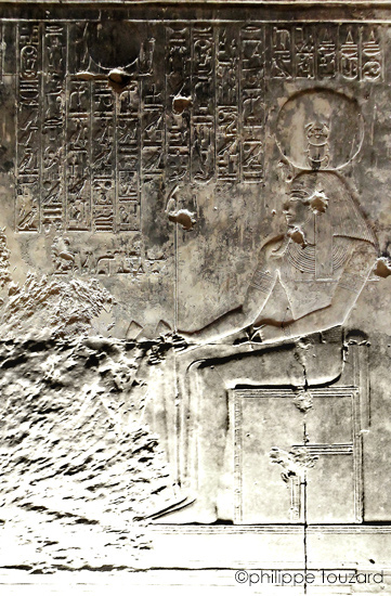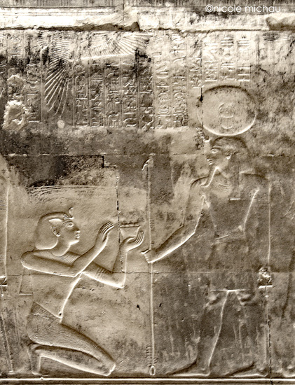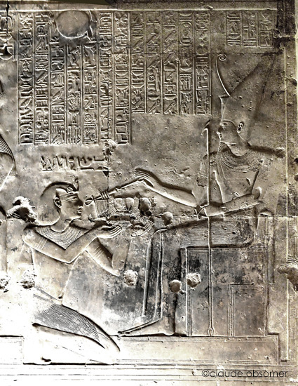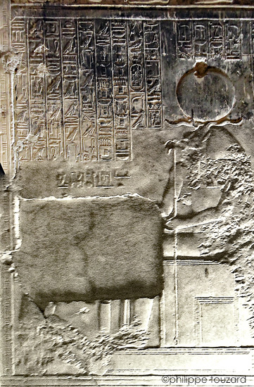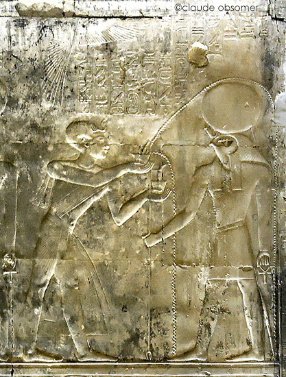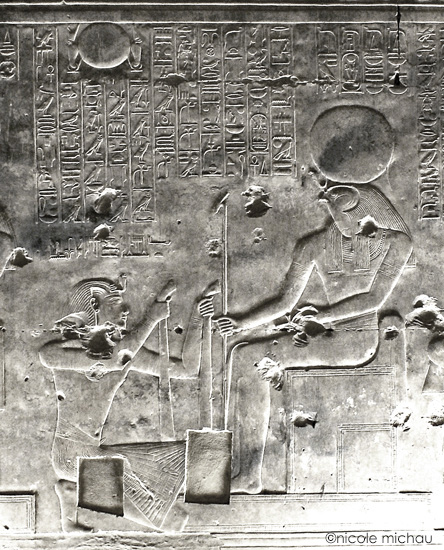 Le roi fait la purification au moyen du bol à libation d'encens avec 4 boulettes d'encens pour Rê-Horakhty. Behedety veille sur la scène.