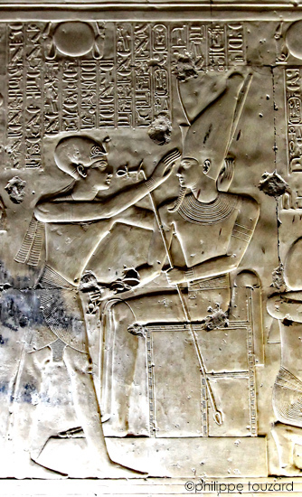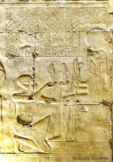 Le roi fait don de l'huile Medj à Rê-Horakhty. Un tableau recensant les offrandes est inscrit en haut de la scène.