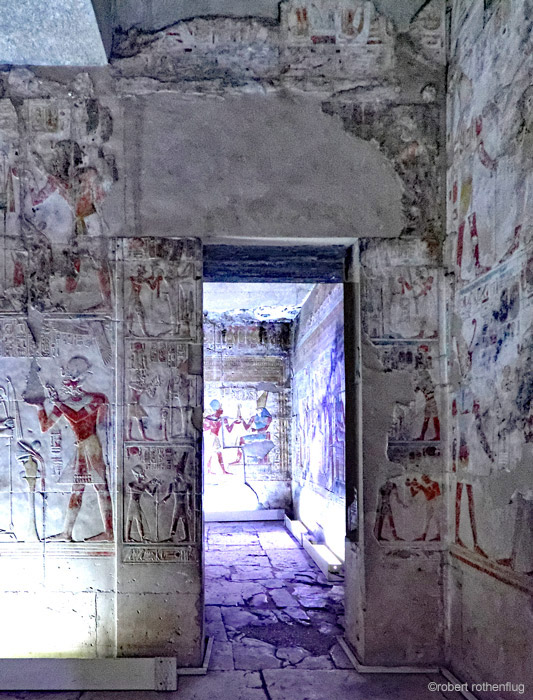 | La porte de la petite chapelle d'Horus se trouve à droite (Est) de la chapelle de Sethy-Osiris. Le linteau a disparu. De chaque côté les montants portent des petites scènes d'offrandes : fleurs, pain, vin, lait. Les écritures sur le passage de la porte et la paroi Sud sont en parie dégradées. Dans le fond, sur la paroi Nord, Horus remet les instruments du pouvoir au roi. |
