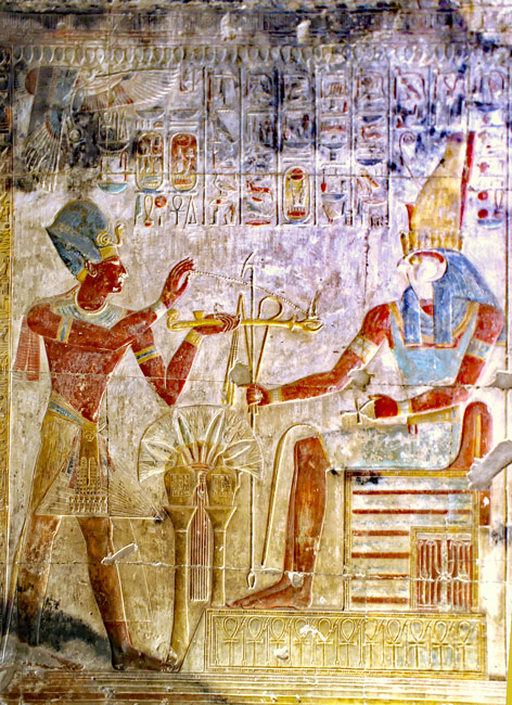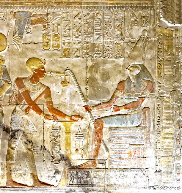 | Le roi lance des boulettes d'encens dans le réceptacle du grand encensoir devant Harendotés, Horus fils d'Osiris. Nekhbet vole dans le ciel. |