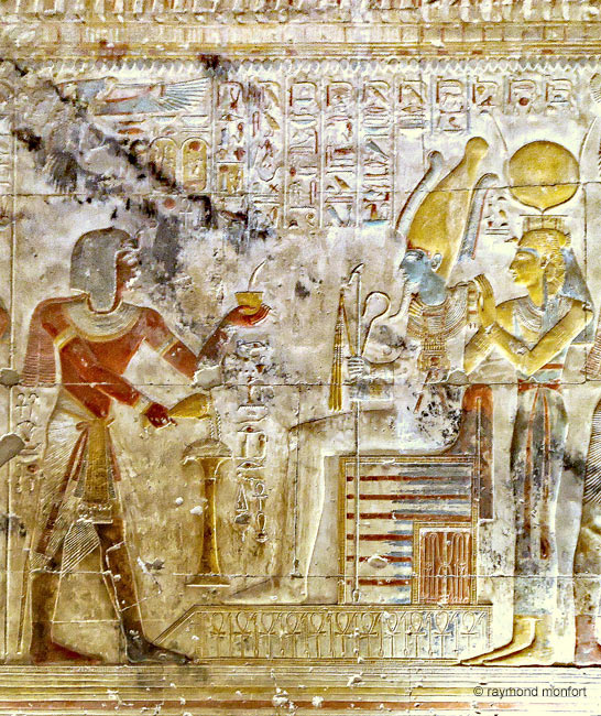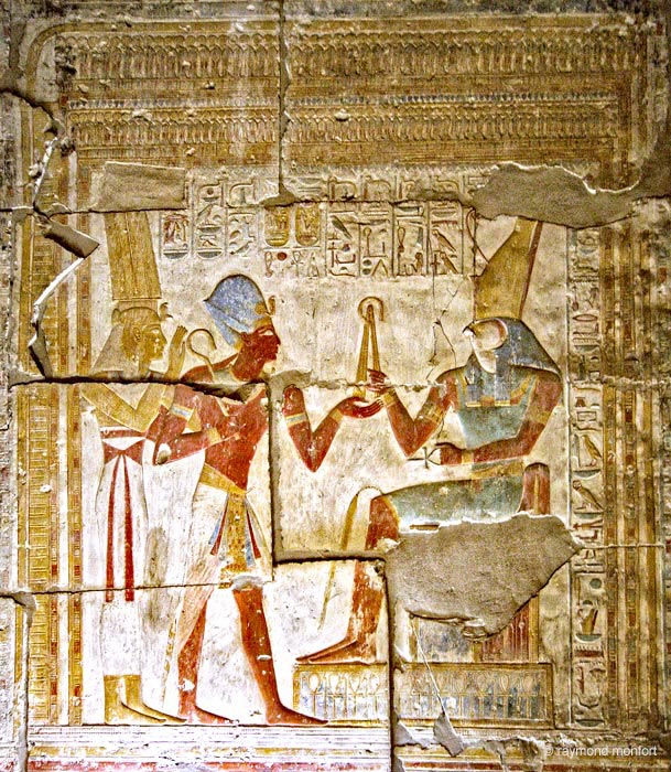Le dieu Horus remet au roi les instruments du pouvoir, le sceptre Heqa et le fouet Nekhakha. Derrière le roi, Isis dit au roi qu'elle est sa mère. et qu'il est le souverain.
