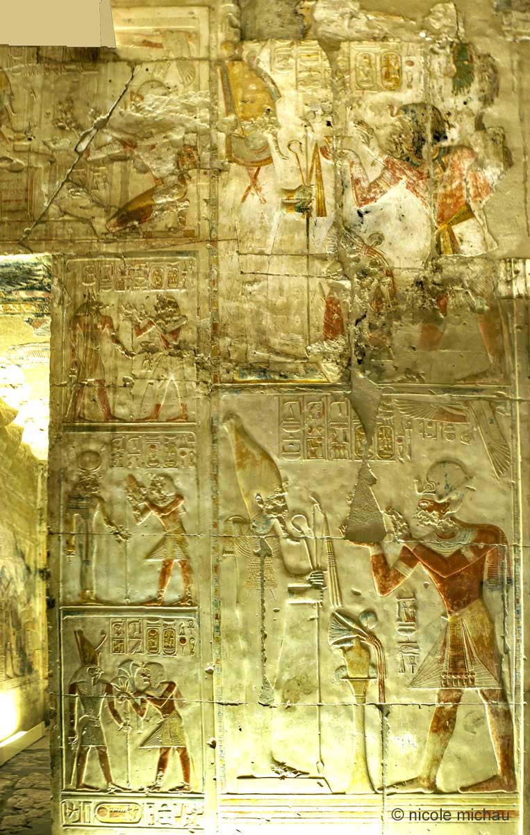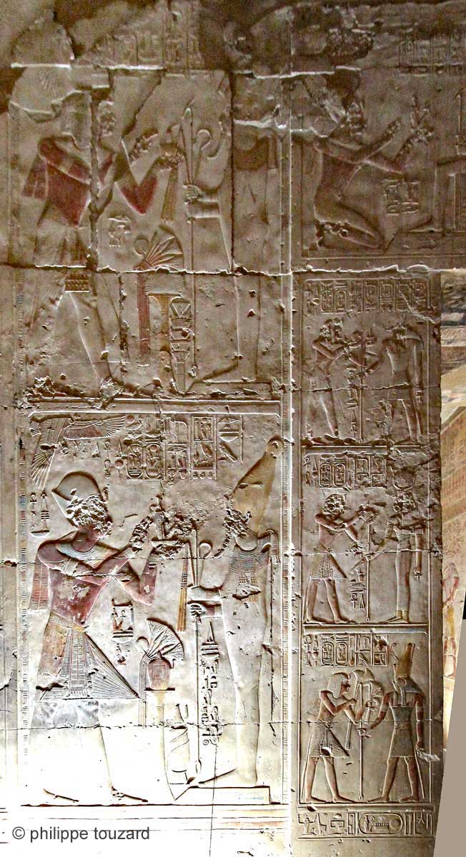 Sur le haut de la paroi Sud, se déroule une frise constituée de cartouches du roi. En dessous, un disque ailé représente Bebedety.