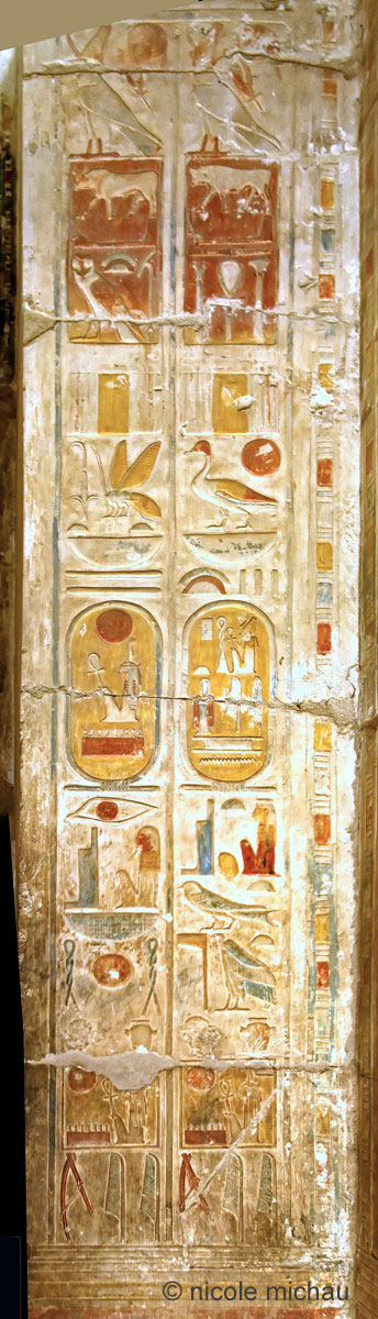 À gauche "L'Horus, taureau puissant couronné dans Thèbes, le Foi de Haute et de basse Egypte, le Maître des Deux-Terres