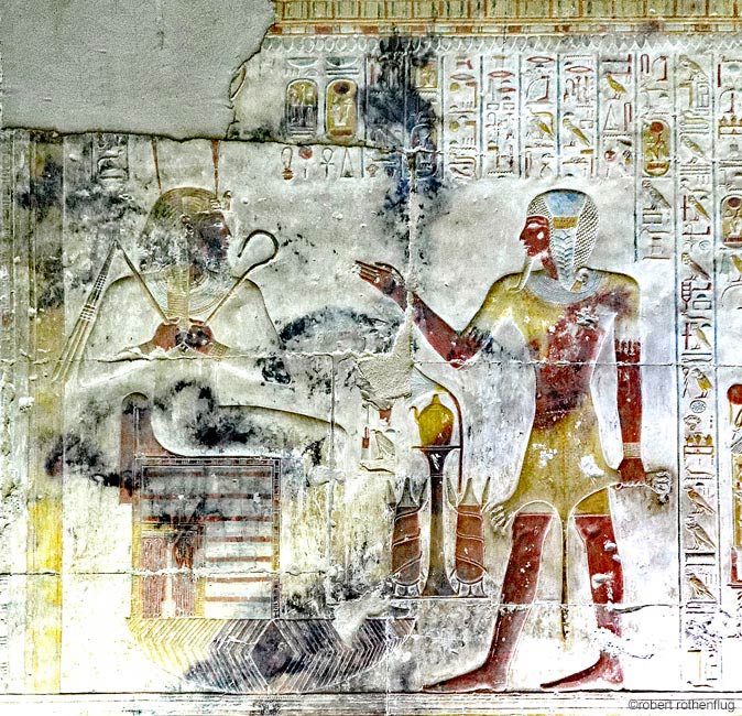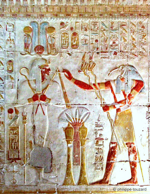 Horus-Iounmoutef qui réside dans le château de MenMaâtRê, purifie les offrandes destinées au roi Sethy divinisé en Osiris, doué de vie. Iounmoutef déclame 4 fois son discours.