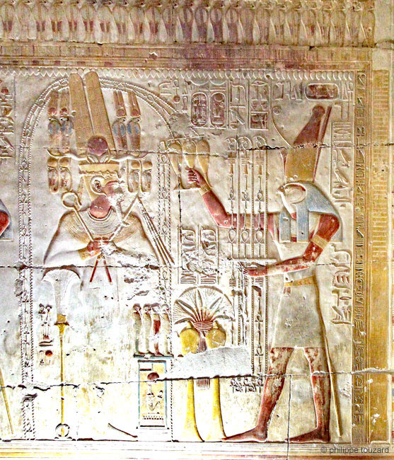 | Le dieu Thot tend le signe de vie au nez du roi transformé en Osiris, mais dit "doué de vie". Il lui donne également les deux uræi couronnés par les couronnes Sem et la couronne Mehou. Le roi est accompagné de son Ka.. |