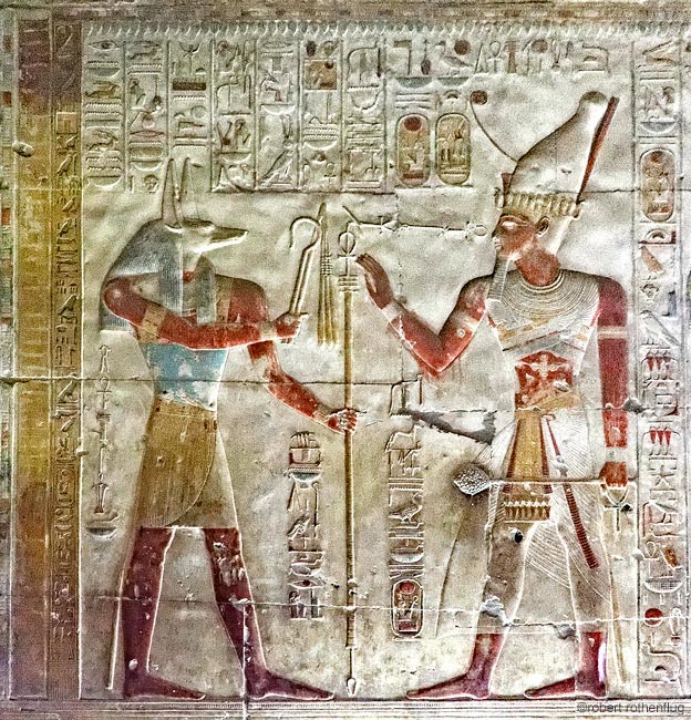 Sethy-Osiris reçoit des mains d'Oupououaout de Haute Égypte (qui réside dans le château de MenMaâtRê) les instruments du pouvoir, le sceptre Heqa et le fouet Nekhakha
