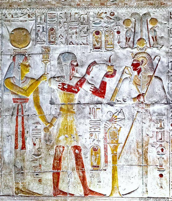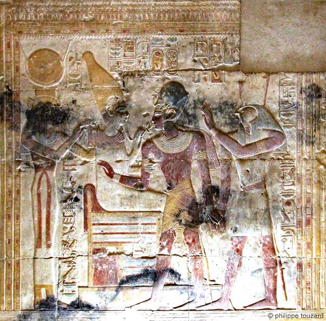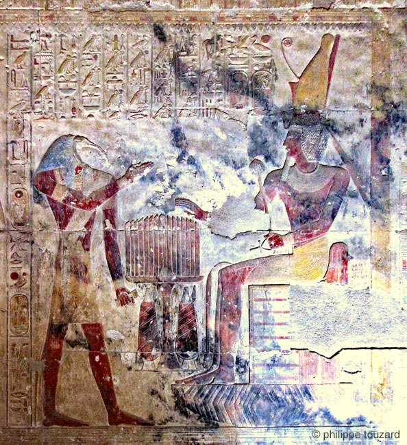 Iounmoutef fumigène de l'encens pour Sethy-Osiris. Isis actionne le sistre 2 fois pour la belle face du roi. Derrière le roi est inscrite la formule de protection, comme souvent dans les scènes : "que toute protection, stabilité et pouvoir, que toute joie l'environnent, comme Rê".