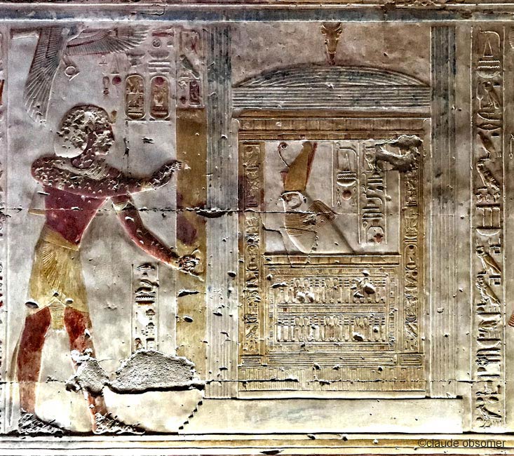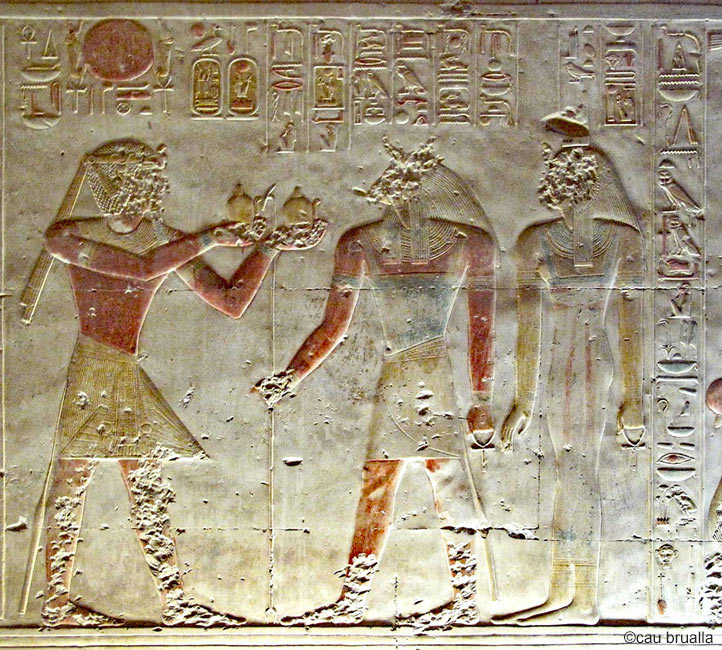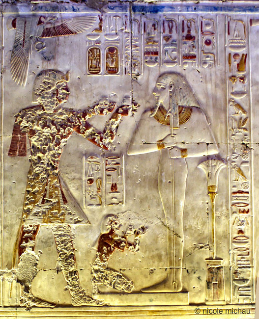 | Le roi . consacre du pain blanc pour le dieu Osiris, assis sur un trône, accompagné d'isis, la mère du dieu. Le dieu lui donne la santé et la stabilité dans la vie éternelle. |