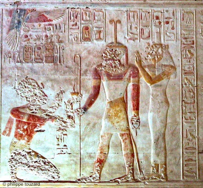 À genoux le roi Sethy fumigène de l'encens pour le dieu Ândjety, "celui d'Ândjet", à la fois le nom d'une localité et celui du IXème nome de Basse Égypte (Corteggiani, ...et ses dieux, p.34. Ce dieu a ensuite été assimilé à Osiris, comme Sokar par exemple. Le dieu donne au roi toute vie, stabilité et pouvoir. Derrière le dieu, sis la grande donne au roi toute santé et toute joie.