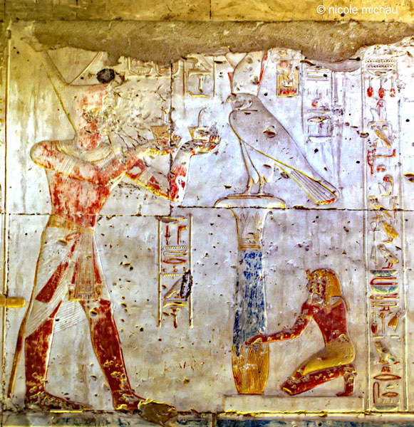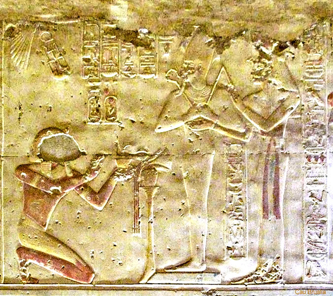 Le roi fumigène de l'encens pour le dieu Horus qui est sur la plante Ouadj tenue par un petit roi.