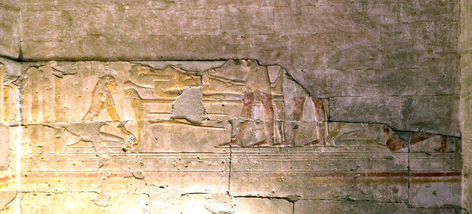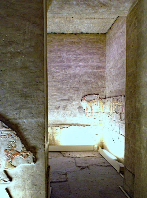 | La chapelle centrale est dédiée à la renaissance d'osiris. Les scènes en sont malheureusement très dégradées et sans inscription. En bas, à gauche, se voit les reste d'une des scènes d'offrandes autour de la porte. |