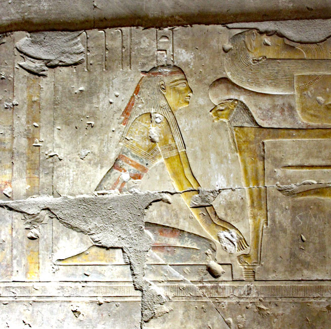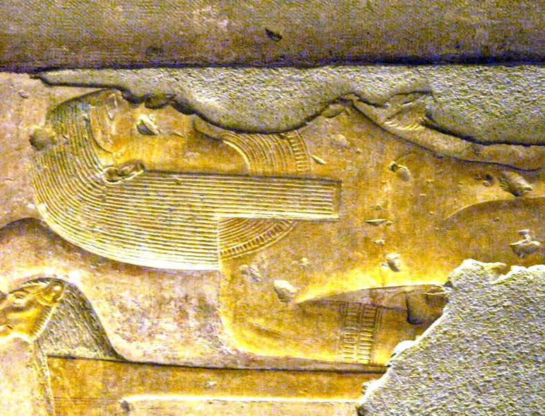 Osiris repose sur sa couche à têtes de lion. À gauche, le déesse Isis est agenouillée (et Nephtys sans doute à droite dont on devine les genoux). Deux dieux s'affairent auprès d'Osiris.