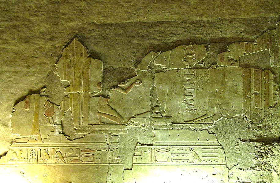 | Dans la scène au dessus du bandeau, le roi offre du vin à son père Osiris qui est sur un socle de statue , suivi par Isis. Dans les textes, le roi est loué pour le beau monument qu'il a fait pour son père. Sur le bandeau du bas, est inscrit le nom des Deux-Maîtresses. |