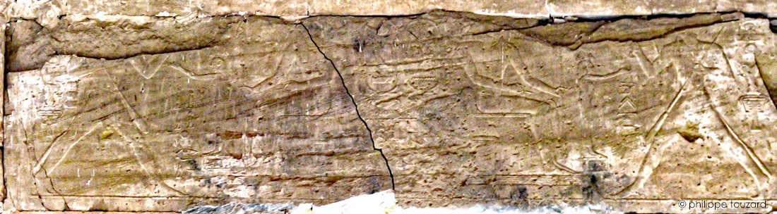 Le linteau : de chaque côté, le roi accomplit une course rituelle devant deux divinités assises sur des trônes.