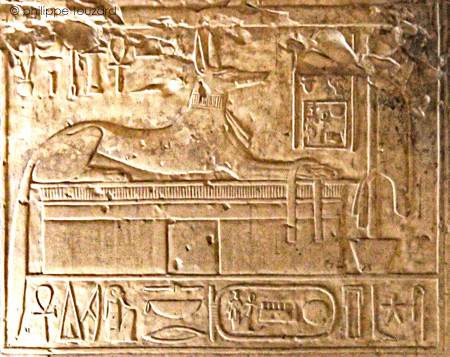 Anubis (nom détruit) qui réside dans le château de MenMaâtRê donne vie, stabilité et pouvoir. En dessous, le nom de la porte. : "(Men-Maât-Rê)I aimé de Sokar".