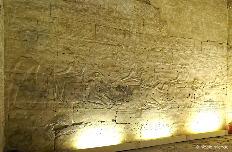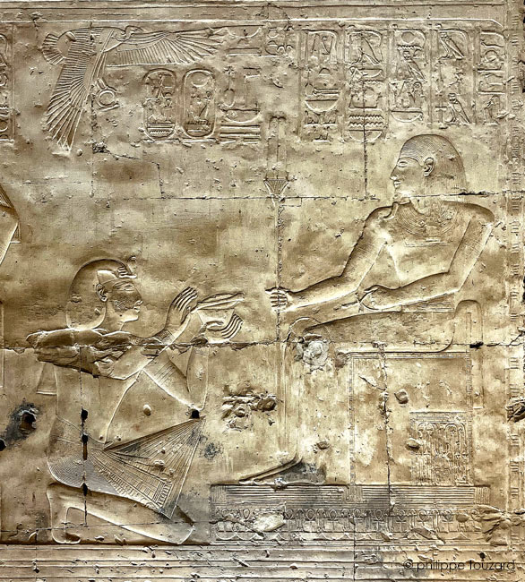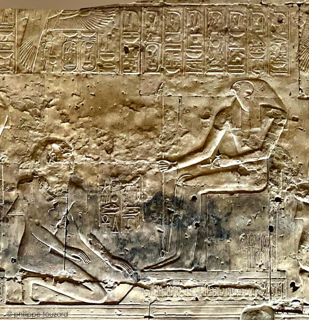 Sethy se prosterne pour adorer 4 fois le dieu Sokar qui réside dans le château de MenMaâtRê. En retour, le dieu lui fait de nombreux dons : vie, stabilité, prospérité, santé, joie et bravoure...Behedety veille sur la scène.
