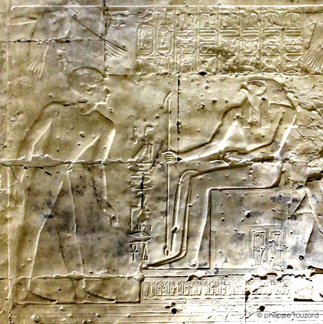| Le roi s'est agenouillé pour adorer encore 4 fois le dieu Sokar. Le dieu lui fait des compliments sur son temple. |