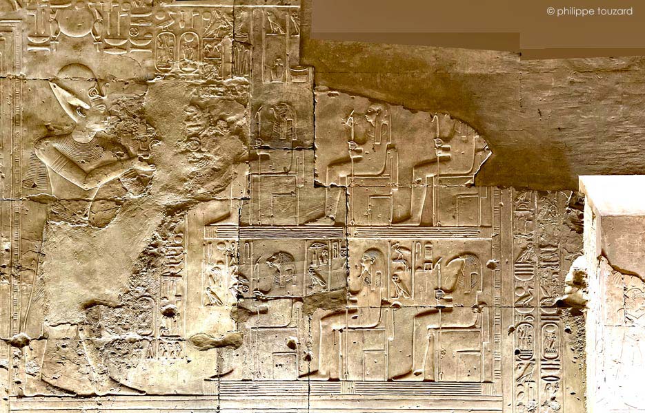 Sethy se prosterne pour adorer 4 fois le dieu Sokar qui réside dans le château de MenMaâtRê. En retour, le dieu lui fait de nombreux dons : vie, stabilité, prospérité, santé, joie et bravoure...Behedety veille sur la scène.