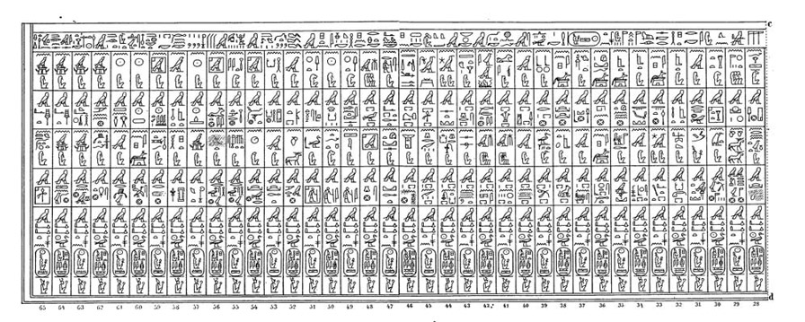 Sur le registre du haut, les noms de : Horus, Isis, Thot, Sekhmet, Grand de pouvoir, Benbenouy, Geb, Chesnou, Thot dans Mekhat, Grand des Cinq et 3 Sobek dans 3 différents sanctuaires.