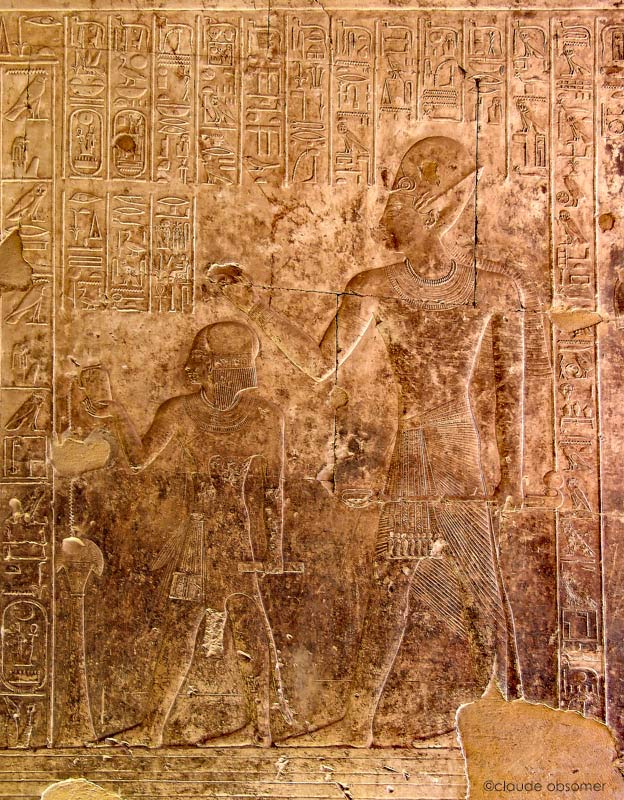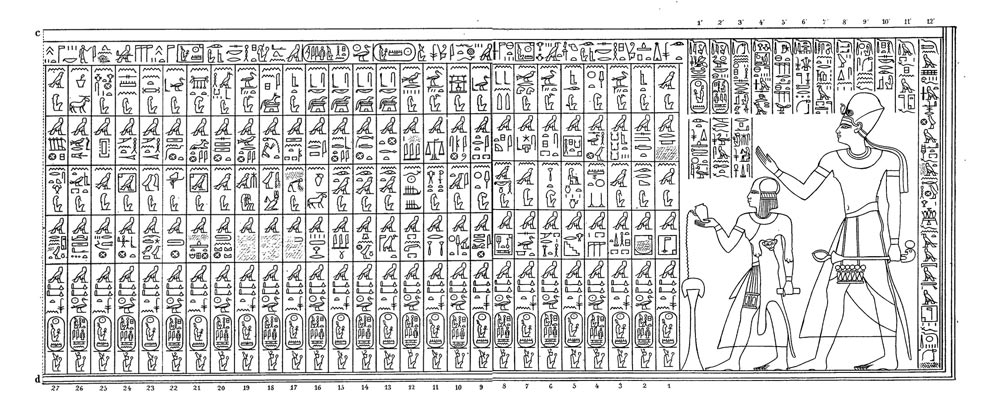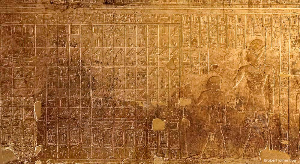 Sethy et le prince devant les 16 premières colonnes de la liste des dieux et de leur sanctuaire.