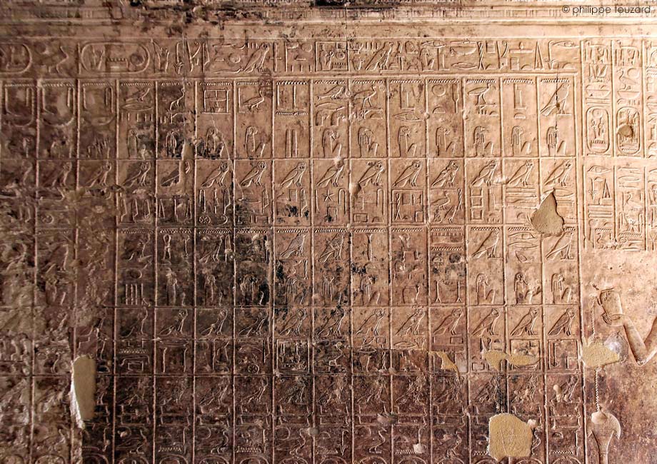 Sur le registre du bas : Horus, la Vue et l'Ouie, Horus dans Tepeh.., les Vêtements dans la demeure du dieu, la Vaisselle, Ouadjet, Horus dans Sat, Hor-Hekenou, Sekhmet, Iat, Khaty-Saty, Mefekh, et 3 fois l'Œil d'Horus,