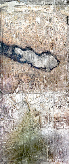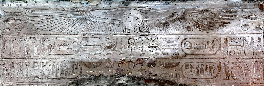 Behedety déploie ses ailes au dessus de la porte/ Le linteau comprend deux lignes de texte comprenant deux phrases chacun. Sur la ligne du haut, le texte commence par : "Que vive le roi .." avec "aim" d'Amon-Eê" à droite et "aimé d'Osiris" à gauche. En dessous les textes indiquent de même "aimé de