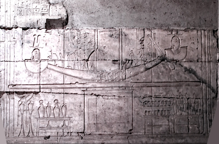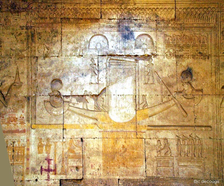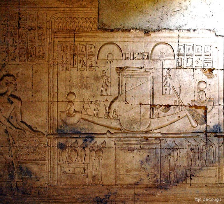 Avec un grand encensoir, le roi fumigène de l'encens (partie de la photo manquante) devant la barque d'Osiris. À l'avant, Oupouaout se tient sur un pavois. Dieux et petits rois s'activent sur la barque