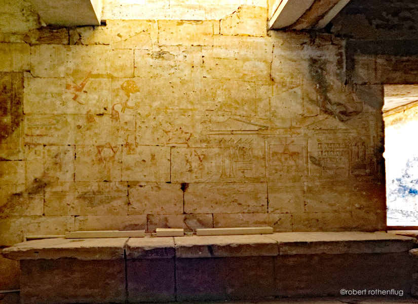 Cette partie de la salle est peu gravée. La scène se devine par endroits, seulement peinte. Deux figures du roi se tournent le dos, faisant des offrandes à des barques différentes. Le roi est représenté avec deux couronnes différentes. |