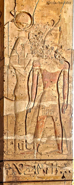 Le texte en dessous constitue de l'inscription de Ramsès II qui fait le tour du pilier : 'Que vive l'Horus, le taureau puissant, aim" de la Maât, le dieu parfait..'.