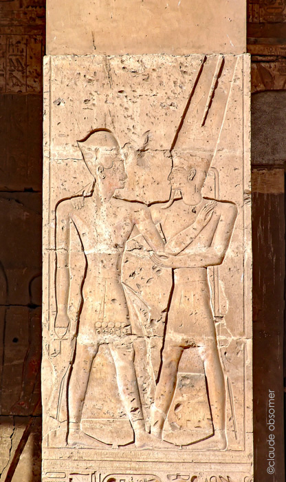 Le texte en dessous est assez bien conservé : "le roi de Haute et Basse Egypte, le maître des Deux Terres (Ouser Maât Rê, Setep n Rê)I, (qui) a pris soin du temple de son père".